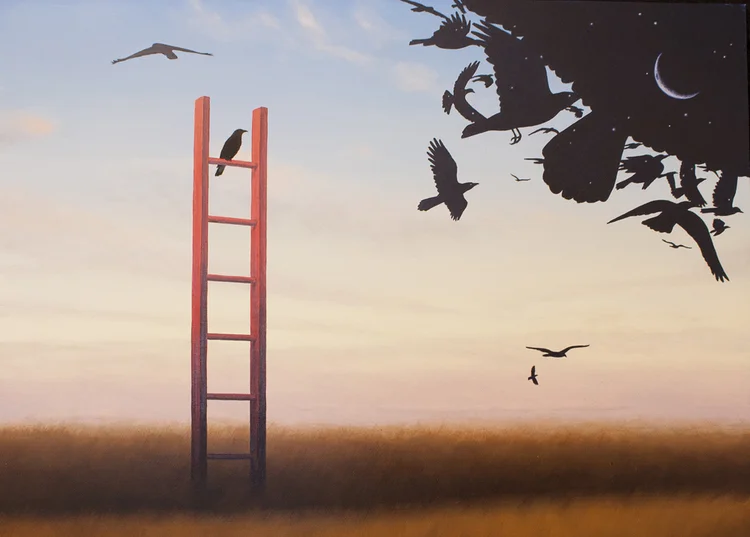 As we've said before, the Fool can be seen as taking a leap of faith, being so certain that you are on the right path that you don’t need to look at the ground beneath your feet. You may not have a lot of experience. That can be an advantage or a disadvantage. The disadvantage in that maybe with more knowledge and experience, you could make more informed decisions. It is an advantage because lacking experience and knowledge, you are not concerned with what cannot be done. So many impossible things are done by people who don’t know any better.The Fool trusts his instinct, but we think it goes deeper than instinct, it’s more like intuition. Traditionally, in the Rider Waite Smith Deck, the little white dog represents that animal instinct that may keep you from falling off the edge, more like that primitive part of our brains that Shawn Achor is talking about. We are taking a twist on this in our card with an animal that has been a frequent character in our paintings, the raven.