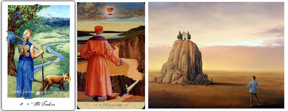 The Fool as Seeker - From left to right, Gaian Soul Tarot, The Grail Tarot, Wanderer by Jim & Lynn Lemyre 2010.