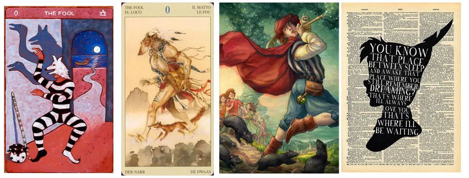 The Fool as Trickster- from left to right - The Tarot de St.Croix, The Native American Tarot, The Pied Piper by Elizabeth Alba, Peter Pan