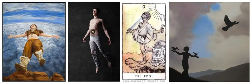 The Fool as The Leap of Faith - from left to right -Painting by Alissa Blaney, The Fool by Jak Flash, Luke Skywalker as the Fool by Elan Rodger, Learning to Fly by Jim & Lynn Lemyre.