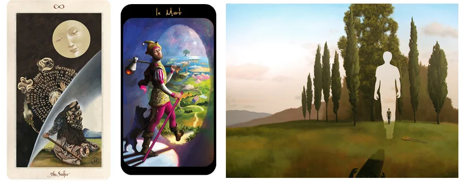 The Fool as Wanderer Between Worlds - left to right Pagan Otherworlds Tarot, Mon Tarot De Marseille by Tarotland, Threshold by Jim & Lynn Lemyre 2005.